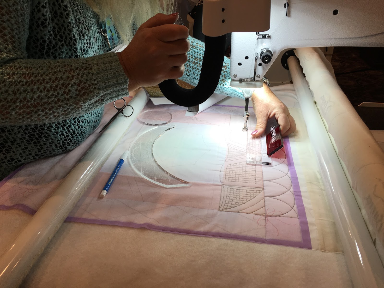 I did 3 classes - all 4-hr hand's on. I got the absolute best room of Handi-Quilter machines. I know we are not supposed to share any favoritism, but seriously, I LOVE my HQ, and having each student on their own machine, with the ability to advance their project at their own rate is priceless. I had my projects all printed at Spoonflower. They were printed in colors, and had quilting lines marked so that I did not have to do this myself! Students loved these projects, and raved about them. Good choice Me! This is my Templates...Ruler the Roost will be offered in TWO sections at MQX Midwest in October -- it is that popular. It is also at Quilt Odyseey for the 22 lucky ones who have already signed up (all sold out!). I may need to simplify that class's project though because they double up on the longarms.