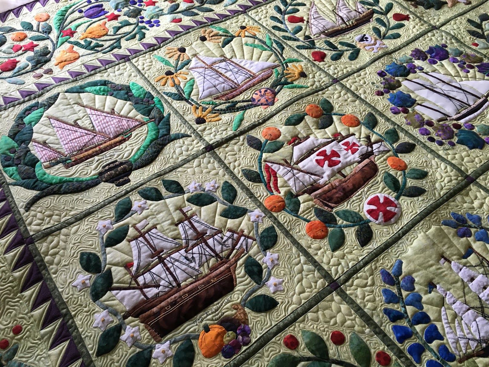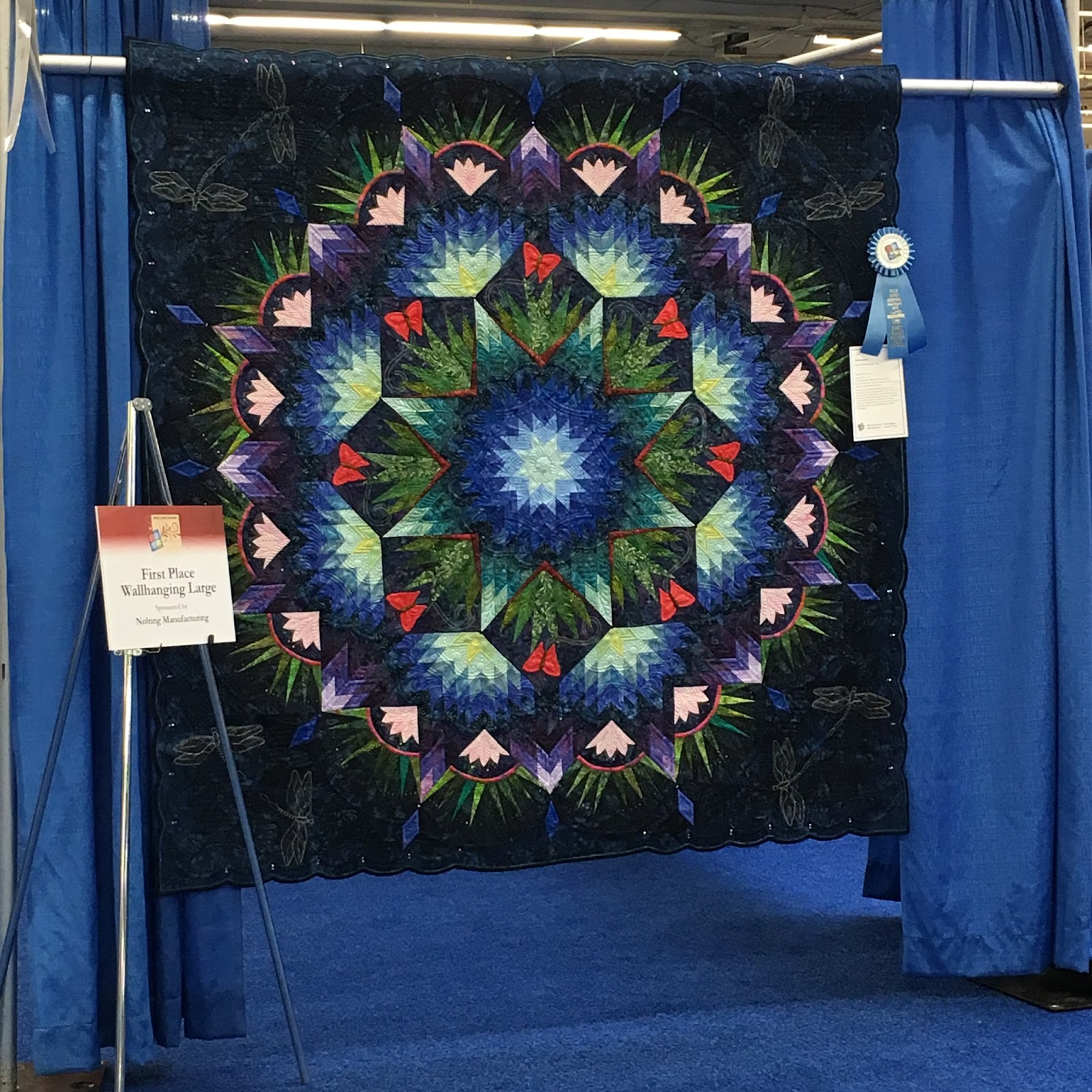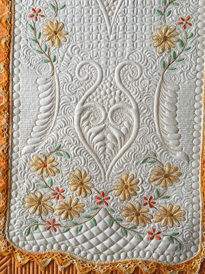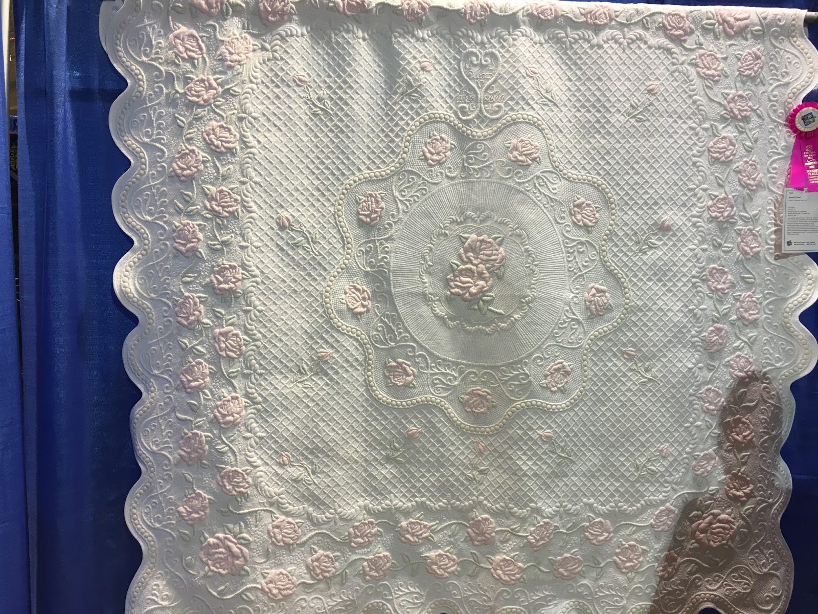 I watched her make this via facebook posts, so I was extremely surprised for it not to ribbon. She's very meticulous in her grid quilting and all designs are exceptionally well stitched. I might have placed the ribbons differently if I were a judge ;-)