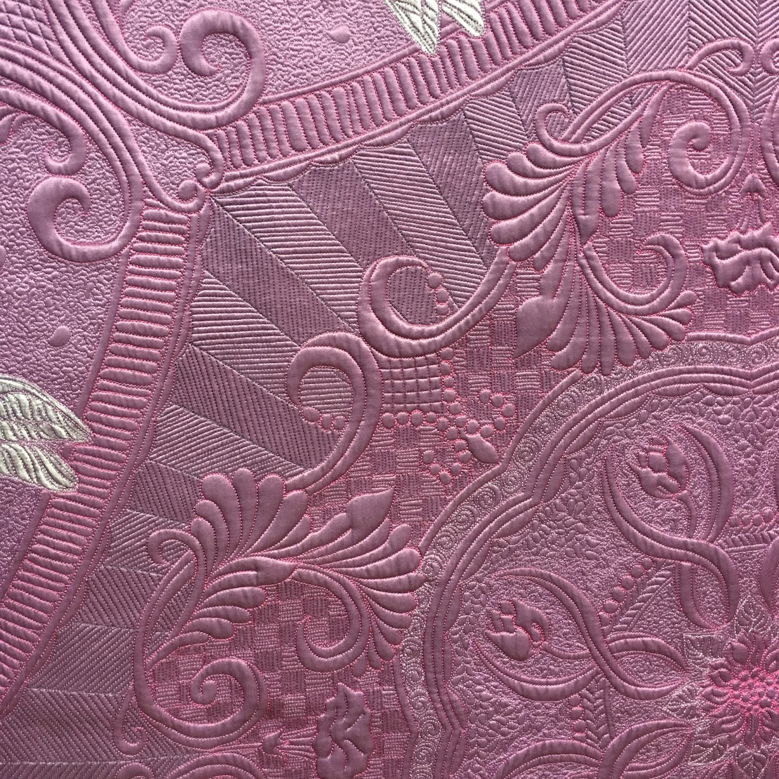 There were 6 whole cloth quilts in this category. I'm going to show snippets of all because there is nothing like a whole cloth to show off the quilting! This next one was quilted on a domestic machine (yes it is large!). It won the 3rd in the category and best machine with a sit-down style machine. It came from Australia, which may explain the wrinkling. Some of the quilts needed a day or two to hang out the creases. Even my silk quilt looked much better by day 2.