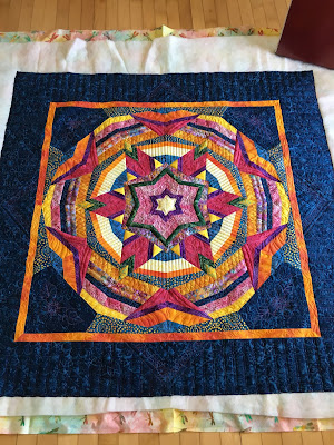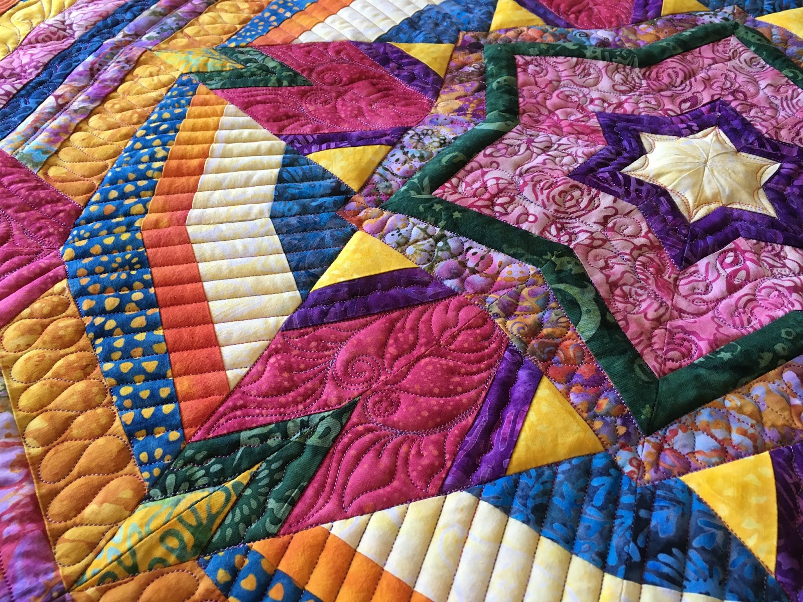 It was hanging in a nicely lit spot with both great overhead light and a skylight. The quilting on the dark blue fabric showed well. Though this quilt is largely about the colorburst and placement of color, I also need the quilting to be there because I enter in machine quilting shows.